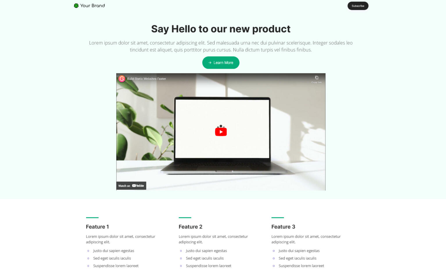 Build customers with our SaaS Product Landing Page Template. Featuring a clear Hero section, testimonials, pricing, and a user-friendly newsletter form.